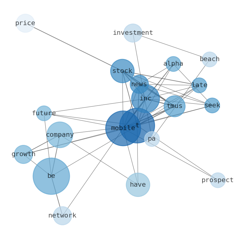 This document will help you to evaluate T-Mobile US without reading an infinite amount of sources. Relying only on stock quotes or prices to make investment decisions is a mistake. Analyzing and observing stock charts, highs and lows and other numerical data does not allow to evaluate the real value of a company. Stock quotes and prices are the result of underlying characteristics of a company and of events and news happening around them. For this reason, investing must be based on information, not numbers. As a solution, we programmed an artificial intelligence that reads the whole internet and the uses natural language processing and vectorizers to summarize the information. Usually, the AI reads several hundred pages and summarize it to a short document. This document presents our results. We found that the most common words in the internet about T-Mobile US are: TMobile, US, company, Inc, stock, price, network, …