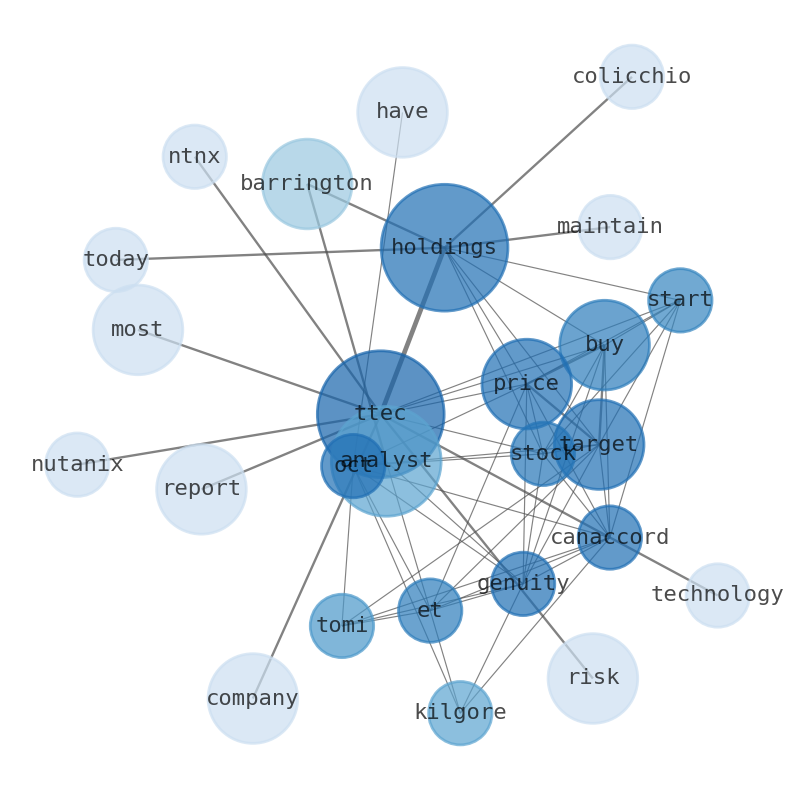 This document will help you to evaluate TTEC Holdings without reading an infinite amount of sources. Relying only on stock quotes or prices to make investment decisions is a mistake. Analyzing and observing stock charts, highs and lows and other numerical data does not allow to evaluate the real value of a company. Stock quotes and prices are the result of underlying characteristics of a company and of events and news happening around them. For this reason, investing must be based on information, not numbers. As a solution, we programmed an artificial intelligence that reads the whole internet and the uses natural language processing and vectorizers to summarize the information. Usually, the AI reads several hundred pages and summarize it to a short document. This document presents our results. We found that the most common words in the internet about TTEC Holdings are: TTEC, Holdings, price, target, report, risk, Barrington, and the most common words in the summary are: ttec, holding, state, united, inc, stock, technology, . One of the sentences in the summary was: TTEC Holdings started at buy with $71 at stock price target at Canaccord Genuity Oct. Other searches related to this term that the AI found were: stockmarketlive, livestock, stockmarketforbeginners, thestockmarket, stockmarkettoday, stockmarkettrading, stockmarketstocks, todaystockmarket, thestockmarket, marketnews, stockmarketnews, whatisstockmarket, usstockmarket, stockmarketopen. #ttec #holding #state #united #inc #stock #technology.