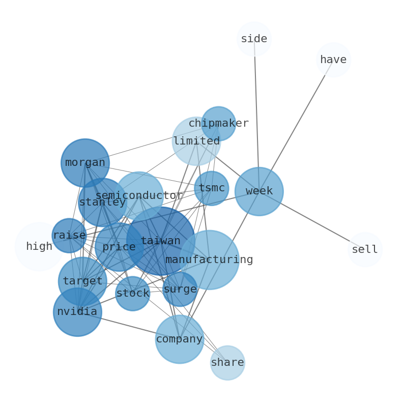 Are looking for the most relevant information about Taiwan Semiconductor Manufacturing Company? Investor spend a lot of time searching for information to make investment decisions in Taiwan Semiconductor Manufacturing Company. This task is often burdensome and consumes huge amounts of free time. It also leads to mistakes due to fatigue and bounded rationality. As a solution, we programmed an artificial intelligence that reads the whole internet and the uses natural language processing and vectorizers to summarize the information. Usually, the AI reads several hundred pages and summarize it to a short document. This document presents our results. We found that the most common words in the internet about Taiwan Semiconductor Manufacturing Company are: Taiwan, Manufacturing, Morgan, Stanley, price, target, Nvidia, and the most common words in the summary are: semiconductor, taiwan, stock, company, manufacture, best, market, . One of the sentences in the summary was: Taiwan Semiconductor Manufacturing Company Limited has a 52-week low of $81.21 and a 52,week high of $135.17. Other searches related to this term that the AI found were: stockmarketlive, livestock, stockmarketforbeginners, thestockmarket, stockmarkettoday, stockmarkettrading, stockmarketstocks, todaystockmarket, thestockmarket, marketnews, stockmarketnews, whatisstockmarket, usstockmarket, stockmarketopen. #semiconductor #taiwan #stock #company #manufacture #best #market.