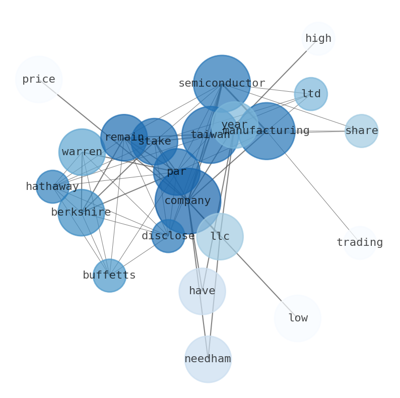 This document will help you to evaluate Taiwan Semiconductor Manufacturing Company without reading an infinite amount of sources. Relying only on stock quotes or prices to make investment decisions is a mistake. Analyzing and observing stock charts, highs and lows and other numerical data does not allow to evaluate the real value of a company. Stock quotes and prices are the result of underlying characteristics of a company and of events and news happening around them. For this reason, investing must be based on information, not numbers. As a solution, we programmed an artificial intelligence that reads the whole internet and the uses natural language processing and vectorizers to summarize the information. Usually, the AI reads several hundred pages and summarize it to a short document. This document presents our results. We found that the most common words in the internet about Taiwan Semiconductor Manufacturing Company are: Company, Taiwan, Warren, Berkshire, par, remain, stake, and the most common words in the summary are: semiconductor, taiwan, company, stock, price, manufacture, market, . One of the sentences in the summary was: Needham and Company LLC have a 1-year low of $59.43 and a 1 year high of $11069.. Other searches related to this term that the AI found were: stockmarketlive, livestock, stockmarketforbeginners, thestockmarket, stockmarkettoday, stockmarkettrading, stockmarketstocks, todaystockmarket, thestockmarket, marketnews, stockmarketnews, whatisstockmarket, usstockmarket, stockmarketopen. #semiconductor #taiwan #company #stock #price #manufacture #market.