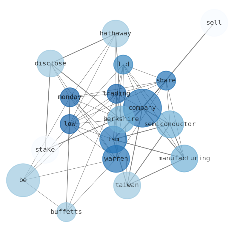 This document will help you to evaluate Taiwan Semiconductor Manufacturing Company without reading an infinite amount of sources. Relying only on stock quotes or prices to make investment decisions is a mistake. Analyzing and observing stock charts, highs and lows and other numerical data does not allow to evaluate the real value of a company. Stock quotes and prices are the result of underlying characteristics of a company and of events and news happening around them. For this reason, investing must be based on information, not numbers. As a solution, we programmed an artificial intelligence that reads the whole internet and the uses natural language processing and vectorizers to summarize the information. Usually, the AI reads several hundred pages and summarize it to a short document. This document presents our results. We found that the most common words in the internet about Taiwan Semiconductor Manufacturing Company are: Taiwan, Semiconductor, Manufacturing, Company, TSM, Warren, Berkshire, and the most common words in the summary are: semiconductor, taiwan, stock, company, report, tsm, tsmc, . One of the sentences in the summary was: Warren Buffett changed his mind on one multi-billion dollar investment in just a matter of months.. Other searches related to this term that the AI found were: stockmarketlive, livestock, stockmarketforbeginners, thestockmarket, stockmarkettoday, stockmarkettrading, stockmarketstocks, todaystockmarket, thestockmarket, marketnews, stockmarketnews, whatisstockmarket, usstockmarket, stockmarketopen. #semiconductor #taiwan #stock #company #report #tsm #tsmc.