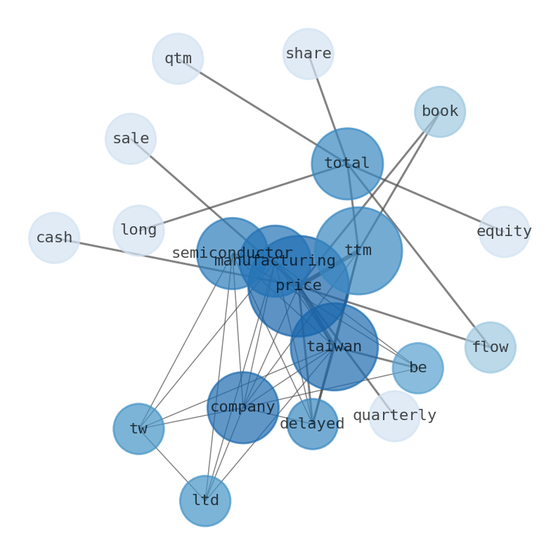 This document will help you to evaluate Taiwan Semiconductor Manufacturing Company without reading an infinite amount of sources. Relying only on stock quotes or prices to make investment decisions is a mistake. Analyzing and observing stock charts, highs and lows and other numerical data does not allow to evaluate the real value of a company. Stock quotes and prices are the result of underlying characteristics of a company and of events and news happening around them. For this reason, investing must be based on information, not numbers. As a solution, we programmed an artificial intelligence that reads the whole internet and the uses natural language processing and vectorizers to summarize the information. Usually, the AI reads several hundred pages and summarize it to a short document. This document presents our results. We found that the most common words in the internet about Taiwan Semiconductor Manufacturing Company are: Price, Taiwan, TTM, …