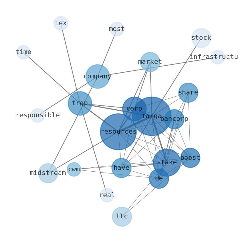 This document will help you to evaluate Targa Resources without reading an infinite amount of sources. Relying only on stock quotes or prices to make investment decisions is a mistake. Analyzing and observing stock charts, highs and lows and other numerical data does not allow to evaluate the real value of a company. Stock quotes and prices are the result of underlying characteristics of a company and of events and news happening around them. For this reason, investing must be based on information, not numbers. As a solution, we programmed an artificial intelligence that reads the whole internet and the uses natural language processing and vectorizers to summarize the information. Usually, the AI reads several hundred pages and summarize it to a short document. This document presents our results. We found that the most common words in the internet about Targa Resources are: Targa, Resources, stake, Corp, company, TRGP, US, …