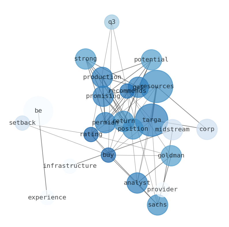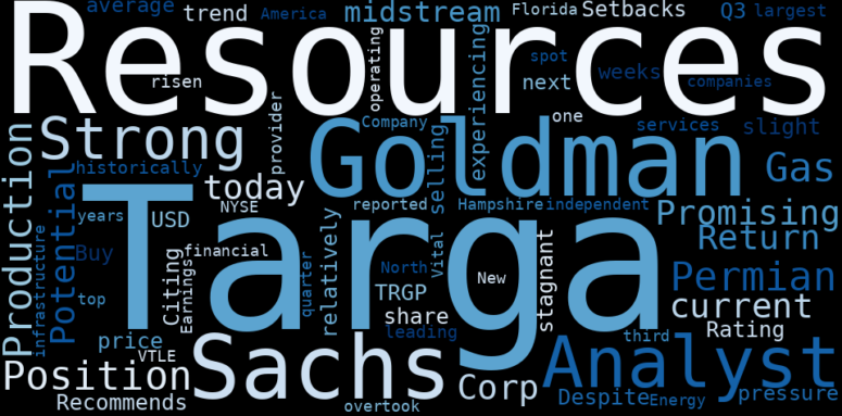Are looking for the most relevant information about Targa Resources? Investor spend a lot of time searching for information to make investment decisions in Targa Resources. This task is often burdensome and consumes huge amounts of free time. It also leads to mistakes due to fatigue and bounded rationality. As a solution, we programmed an artificial intelligence that reads the whole internet and the uses natural language processing and vectorizers to summarize the information. Usually, the AI reads several hundred pages and summarize it to a short document. This document presents our results. We found that the most common words in the internet about Targa Resources are: Targa, Resources, Goldman, Sachs, Strong, Promising, current, and the most common words in the summary are: resource, targa, energy, chevron_right, job, gas, price, . One of the sentences in the summary was: The current trend is relatively stagnant and TRGP is experiencing slight …