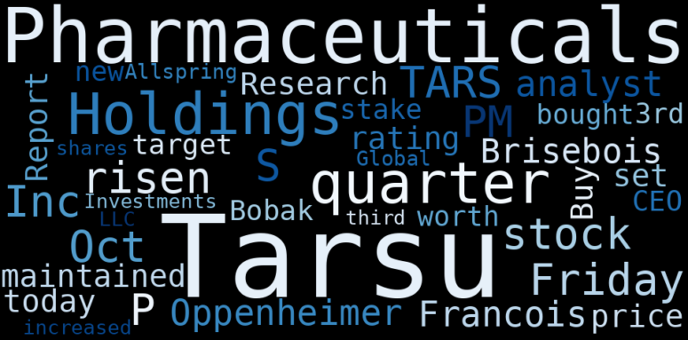 How much time have you spent trying to decide whether investing in Tarsus Pharmaceuticals? Many investors start with the dream of being free. They expect to find on the stock market an option to have time to develop their own interests and hobbies. That is, a way to escape a 9 to 5 job. However, investment is complex and investors end up spending whole days (and nights) trying to figure out which the right stock to invest is. The dream of stock investing becomes the nightmare of facing infinity amounts of information. As a solution, we programmed an artificial intelligence that reads the whole internet and the uses natural language processing and vectorizers to summarize the information. Usually, the AI reads several hundred pages and summarize it to a short document. This document presents our results. We found that the most common words in the internet about Tarsus Pharmaceuticals are: …