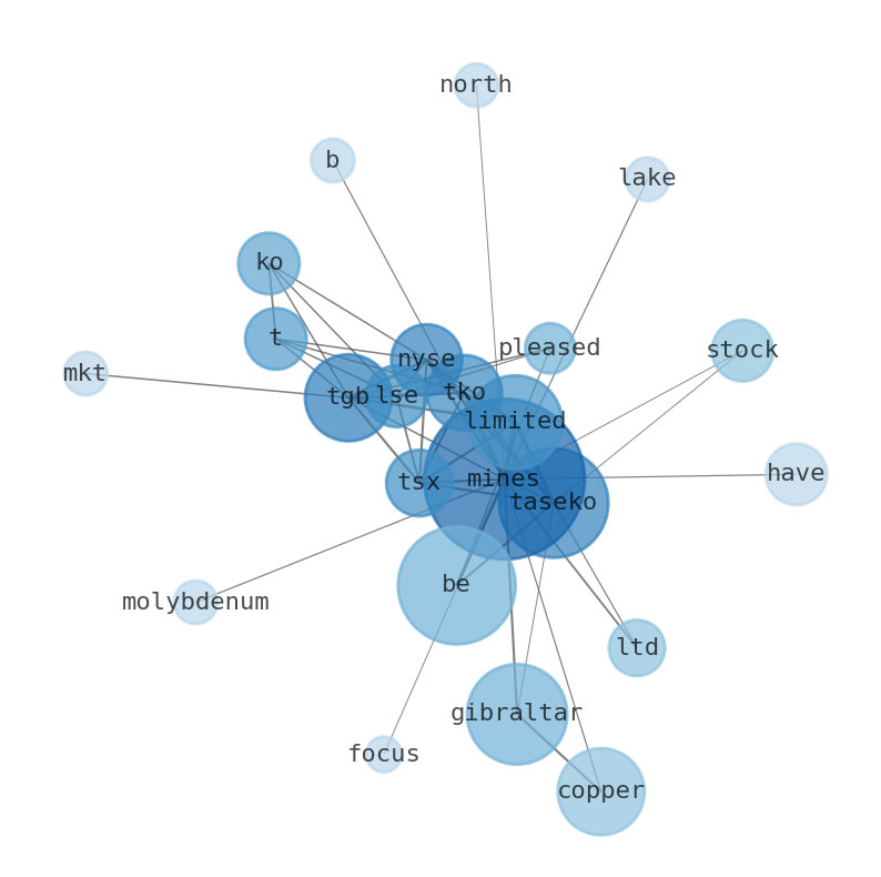 Are looking for the most relevant information about Taseko Mines? Investor spend a lot of time searching for information to make investment decisions in Taseko Mines. This task is often burdensome and consumes huge amounts of free time. It also leads to mistakes due to fatigue and bounded rationality. As a solution, we programmed an artificial intelligence that reads the whole internet and the uses natural language processing and vectorizers to summarize the information. Usually, the AI reads several hundred pages and summarize it to a short document. This document presents our results. We found that the most common words in the internet about Taseko Mines are: Mines, Taseko, Gibraltar, Limited, mine, TGB, copper, and the most common words in the summary are: mine, ltd, corp, taseko, gibraltar, inc, resource, . One of the sentences in the summary was: (tgb) (tGB) (TKO) (TSE:T KO) (NYSE: TGB) is a leading North American copper company. Other searches related to this term that the AI found were: stockmarketlive, livestock, stockmarketforbeginners, thestockmarket, stockmarkettoday, stockmarkettrading, stockmarketstocks, todaystockmarket, thestockmarket, marketnews, stockmarketnews, whatisstockmarket, usstockmarket, stockmarketopen. #mine #ltd #corp #taseko #gibraltar #inc #resource.