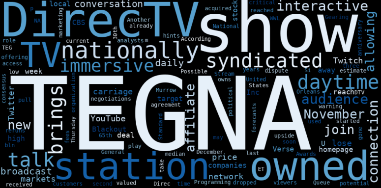 Are looking for the most relevant information about Tegna? Investor spend a lot of time searching for information to make investment decisions in Tegna. This task is often burdensome and consumes huge amounts of free time. It also leads to mistakes due to fatigue and bounded rationality. As a solution, we programmed an artificial intelligence that reads the whole internet and the uses natural language processing and vectorizers to summarize the information. Usually, the AI reads several hundred pages and summarize it to a short document. This document presents our results. We found that the most common words in the internet about Tegna are: show, Tegna, station, DirecTV, TV, TEGNAowned, nationally, and the most common words in the summary are: tegna, tv, job, station, directv, show, news, . One of the sentences in the summary was: ET on Thursday (November 30) If no deal is reached by November 30th, Tegna …