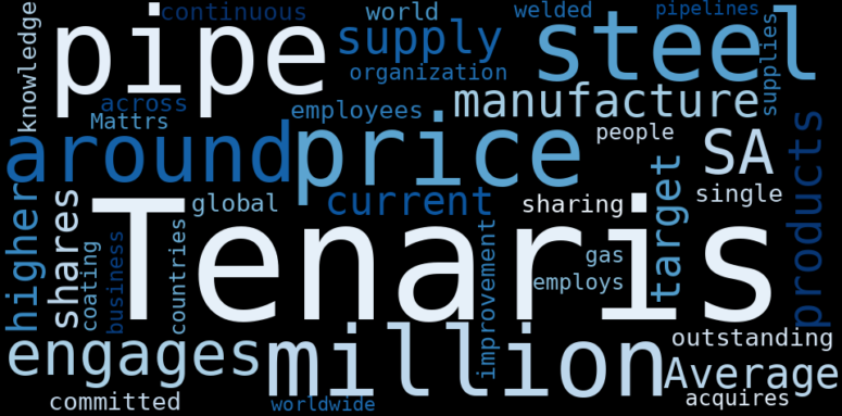 Are looking for the most relevant information about Tenaris? Investor spend a lot of time searching for information to make investment decisions in Tenaris. This task is often burdensome and consumes huge amounts of free time. It also leads to mistakes due to fatigue and bounded rationality. As a solution, we programmed an artificial intelligence that reads the whole internet and the uses natural language processing and vectorizers to summarize the information. Usually, the AI reads several hundred pages and summarize it to a short document. This document presents our results. We found that the most common words in the internet about Tenaris are: Tenaris, pipe, supply, steel, price, share, SA, and the most common words in the summary are: job, tenaris, bloomberg, market, dec22, report, oil, . One of the sentences in the summary was: Tenaris acquires Mattrs pipe coating business for over $182 million. Other searches related to …