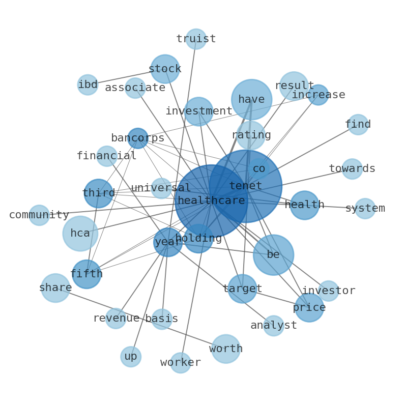 This document will help you to evaluate Tenet Healthcare without reading an infinite amount of sources. Relying only on stock quotes or prices to make investment decisions is a mistake. Analyzing and observing stock charts, highs and lows and other numerical data does not allow to evaluate the real value of a company. Stock quotes and prices are the result of underlying characteristics of a company and of events and news happening around them. For this reason, investing must be based on information, not numbers. As a solution, we programmed an artificial intelligence that reads the whole internet and the uses natural language processing and vectorizers to summarize the information. Usually, the AI reads several hundred pages and summarize it to a short document. This document presents our results. We found that the most common words in the internet about Tenet Healthcare are: Tenet, Healthcare, healthcare, HCA, Fifth, Third, holding, and the most common words in the summary are: healthcare, tenet, market, private, stock, health, global, . One of the sentences in the summary was: increased its holdings in the company. Other searches related to this term that the AI found were: stockmarketlive, livestock, stockmarketforbeginners, thestockmarket, stockmarkettoday, stockmarkettrading, stockmarketstocks, todaystockmarket, thestockmarket, marketnews, stockmarketnews, whatisstockmarket, usstockmarket, stockmarketopen. #healthcare #tenet #market #private #stock #health #global.