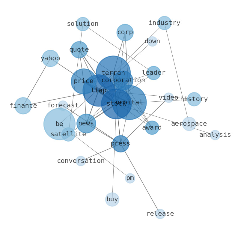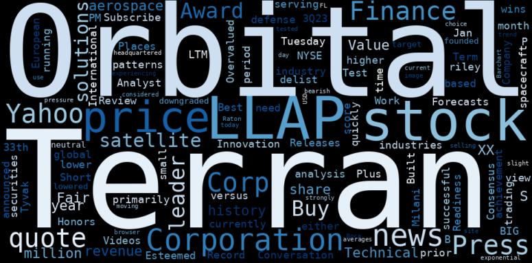 How much time have you spent trying to decide whether investing in Terran Orbital? Many investors start with the dream of being free. They expect to find on the stock market an option to have time to develop their own interests and hobbies. That is, a way to escape a 9 to 5 job. However, investment is complex and investors end up spending whole days (and nights) trying to figure out which the right stock to invest is. The dream of stock investing becomes the nightmare of facing infinity amounts of information. As a solution, we programmed an artificial intelligence that reads the whole internet and the uses natural language processing and vectorizers to summarize the information. Usually, the AI reads several hundred pages and summarize it to a short document. This document presents our results. We found that the most common words in the internet about Terran Orbital are: Terran, Orbital, stock, LLAP, price, Corporation, Stock, and the most common words in the summary are: orbital, terran, stock, llap, market, business, news, . One of the sentences in the summary was: Biley securities downgraded the stock from buy to neutral.. Other searches related to this term that the AI found were: stockmarketlive, livestock, stockmarketforbeginners, thestockmarket, stockmarkettoday, stockmarkettrading, stockmarketstocks, todaystockmarket, thestockmarket, marketnews, stockmarketnews, whatisstockmarket, usstockmarket, stockmarketopen. #orbital #terran #stock #llap #market #business #news.