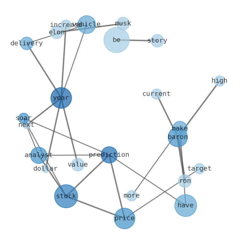 This document will help you to evaluate Tesla without reading an infinite amount of sources. Relying only on stock quotes or prices to make investment decisions is a mistake. Analyzing and observing stock charts, highs and lows and other numerical data does not allow to evaluate the real value of a company. Stock quotes and prices are the result of underlying characteristics of a company and of events and news happening around them. For this reason, investing must be based on information, not numbers. As a solution, we programmed an artificial intelligence that reads the whole internet and the uses natural language processing and vectorizers to summarize the information. Usually, the AI reads several hundred pages and summarize it to a short document. This document presents our results. We found that the most common words in the internet about Tesla are: Tesla, stock, year, price, vehicle, Baron, company, and the …