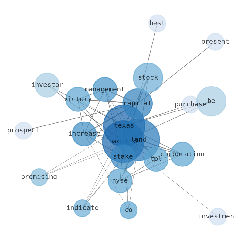 This document will help you to evaluate Texas Pacific Land without reading an infinite amount of sources. Relying only on stock quotes or prices to make investment decisions is a mistake. Analyzing and observing stock charts, highs and lows and other numerical data does not allow to evaluate the real value of a company. Stock quotes and prices are the result of underlying characteristics of a company and of events and news happening around them. For this reason, investing must be based on information, not numbers. As a solution, we programmed an artificial intelligence that reads the whole internet and the uses natural language processing and vectorizers to summarize the information. Usually, the AI reads several hundred pages and summarize it to a short document. This document presents our results. We found that the most common words in the internet about Texas Pacific Land are: Texas, Pacific, Capital, Land, stock, …