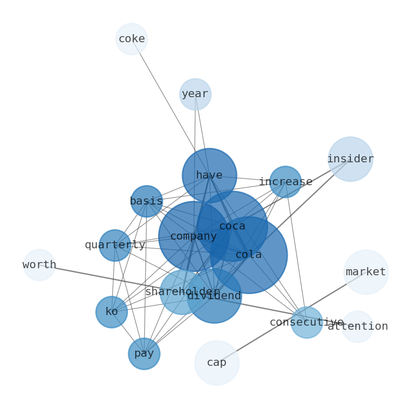 Are looking for the most relevant information about The Coca-Cola Company? Investor spend a lot of time searching for information to make investment decisions in The Coca-Cola Company. This task is often burdensome and consumes huge amounts of free time. It also leads to mistakes due to fatigue and bounded rationality. As a solution, we programmed an artificial intelligence that reads the whole internet and the uses natural language processing and vectorizers to summarize the information. Usually, the AI reads several hundred pages and summarize it to a short document. This document presents our results. We found that the most common words in the internet about The Coca-Cola Company are: CocaCola, Company, dividend, Insiders, company, market, cap, and the most common words in the summary are: cocacola, stock, market, company, republic, news, new, . One of the sentences in the summary was: Coca-Cola Insiders Sold US$15m Of Shares Suggesting Hesitancy. …