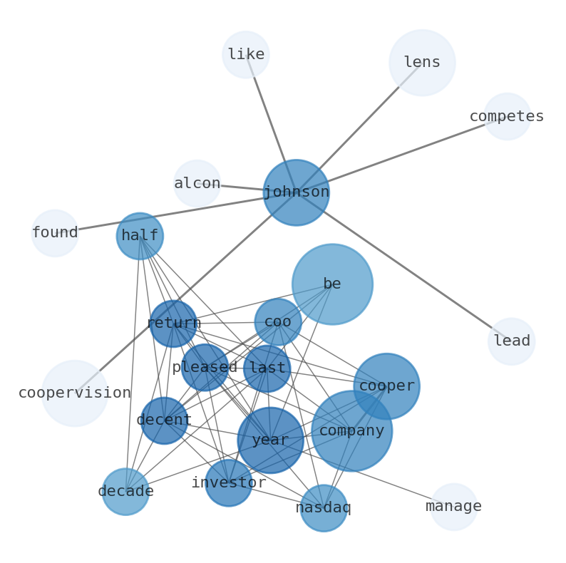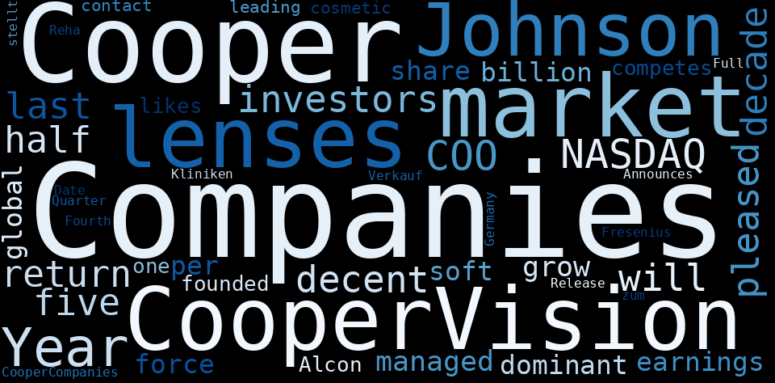 This document will help you to evaluate The Cooper Companies without reading an infinite amount of sources. Relying only on stock quotes or prices to make investment decisions is a mistake. Analyzing and observing stock charts, highs and lows and other numerical data does not allow to evaluate the real value of a company. Stock quotes and prices are the result of underlying characteristics of a company and of events and news happening around them. For this reason, investing must be based on information, not numbers. As a solution, we programmed an artificial intelligence that reads the whole internet and the uses natural language processing and vectorizers to summarize the information. Usually, the AI reads several hundred pages and summarize it to a short document. This document presents our results. We found that the most common words in the internet about The Cooper Companies are: Cooper, Companies, CooperVision, market, Johnson, NASDAQCOO, investor, and the most common words in the summary are: cooper, company, market, stock, news, ago, hour, . One of the sentences in the summary was: Fresenius stellt Reha-Kliniken zum Verkauf in Germany.. Other searches related to this term that the AI found were: stockmarketlive, livestock, stockmarketforbeginners, thestockmarket, stockmarkettoday, stockmarkettrading, stockmarketstocks, todaystockmarket, thestockmarket, marketnews, stockmarketnews, whatisstockmarket, usstockmarket, stockmarketopen. #cooper #company #market #stock #news #ago #hour.