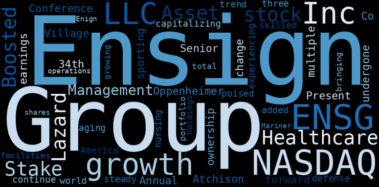 The game is changing. There is a new strategy to evaluate The Ensign Group fundamental value, possible risks and most salient advantages. Investors have traditionally relied in reading large amounts of text to evaluate the fundamental value of a stock or company. However, the development of Artificial Intelligence (AI) tools is modifying the way investments are evaluated in markets. Today, machine learning, natural language processing and bigdata allow making this process automatic, reducing large amounts of text to the elements that have a higher activation in a neural network. We programmed an artificial intelligence that reads the whole internet and the uses natural language processing and vectorizers to summarize the information. Usually, the AI reads several hundred pages and summarize it to a short document. This document presents our results. We found that the most common words in the internet about The Ensign Group are: Ensign, Group, growth, Inc, NASDAQENSG, …