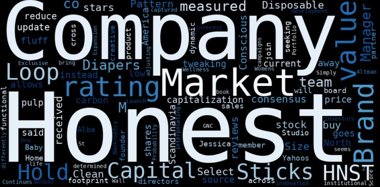 This document will help you to evaluate The Honest Company without reading an infinite amount of sources. Relying only on stock quotes or prices to make investment decisions is a mistake. Analyzing and observing stock charts, highs and lows and other numerical data does not allow to evaluate the real value of a company. Stock quotes and prices are the result of underlying characteristics of a company and of events and news happening around them. For this reason, investing must be based on information, not numbers. As a solution, we programmed an artificial intelligence that reads the whole internet and the uses natural language processing and vectorizers to summarize the information. Usually, the AI reads several hundred pages and summarize it to a short document. This document presents our results. We found that the most common words in the internet about The Honest Company are: Honest, Company, value, Loop, Capital, …