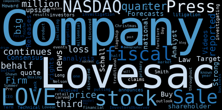 Are looking for the most relevant information about The Lovesac Company? Investor spend a lot of time searching for information to make investment decisions in The Lovesac Company. This task is often burdensome and consumes huge amounts of free time. It also leads to mistakes due to fatigue and bounded rationality. As a solution, we programmed an artificial intelligence that reads the whole internet and the uses natural language processing and vectorizers to summarize the information. Usually, the AI reads several hundred pages and summarize it to a short document. This document presents our results. We found that the most common words in the internet about The Lovesac Company are: Company, Lovesac, fiscal, LOVE, stock, Press, quarter, and the most common words in the summary are: lovesac, company, stock, news, market, earnings, customer, . One of the sentences in the summary was: The Schall Law Firm, a national shareholder rights …