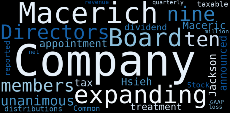 Are looking for the most relevant information about The Macerich Company? Investor spend a lot of time searching for information to make investment decisions in The Macerich Company. This task is often burdensome and consumes huge amounts of free time. It also leads to mistakes due to fatigue and bounded rationality. As a solution, we programmed an artificial intelligence that reads the whole internet and the uses natural language processing and vectorizers to summarize the information. Usually, the AI reads several hundred pages and summarize it to a short document. This document presents our results. We found that the most common words in the internet about The Macerich Company are: Company, Macerich, expand, Board, Directors, ten, member, and the most common words in the summary are: report, share, reit, company, space, stock, note, . One of the sentences in the summary was: The Maceric Company announced the tax treatment for dividend distributions taxable in 2023 on its Common Stock. Other searches related to this term that the AI found were: stockmarketlive, livestock, stockmarketforbeginners, thestockmarket, stockmarkettoday, stockmarkettrading, stockmarketstocks, todaystockmarket, thestockmarket, marketnews, stockmarketnews, whatisstockmarket, usstockmarket, stockmarketopen. #report #share #reit #company #space #stock #note.