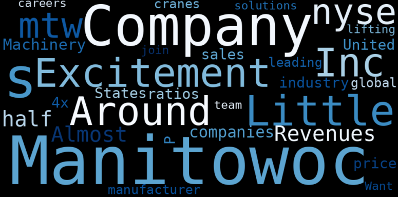 The game is changing. There is a new strategy to evaluate The Manitowoc Company fundamental value, possible risks and most salient advantages. Investors have traditionally relied in reading large amounts of text to evaluate the fundamental value of a stock or company. However, the development of Artificial Intelligence (AI) tools is modifying the way investments are evaluated in markets. Today, machine learning, natural language processing and bigdata allow making this process automatic, reducing large amounts of text to the elements that have a higher activation in a neural network. We programmed an artificial intelligence that reads the whole internet and the uses natural language processing and vectorizers to summarize the information. Usually, the AI reads several hundred pages and summarize it to a short document. This document presents our results. We found that the most common words in the internet about The Manitowoc Company are: Manitowoc, Company, Little, Excitement, Incs, …