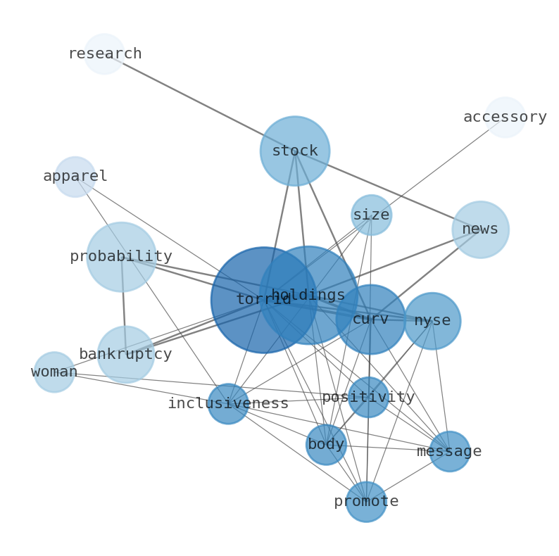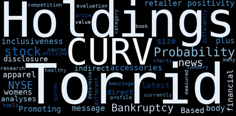 The game is changing. There is a new strategy to evaluate Torrid Holdings fundamental value, possible risks and most salient advantages. Investors have traditionally relied in reading large amounts of text to evaluate the fundamental value of a stock or company. However, the development of Artificial Intelligence (AI) tools is modifying the way investments are evaluated in markets. Today, machine learning, natural language processing and bigdata allow making this process automatic, reducing large amounts of text to the elements that have a higher activation in a neural network. We programmed an artificial intelligence that reads the whole internet and the uses natural language processing and vectorizers to summarize the information. Usually, the AI reads several hundred pages and summarize it to a short document. This document presents our results. We found that the most common words in the internet about Torrid Holdings are: Torrid, Holdings, stock, Probability, news, NYSECURV, Promoting, …
