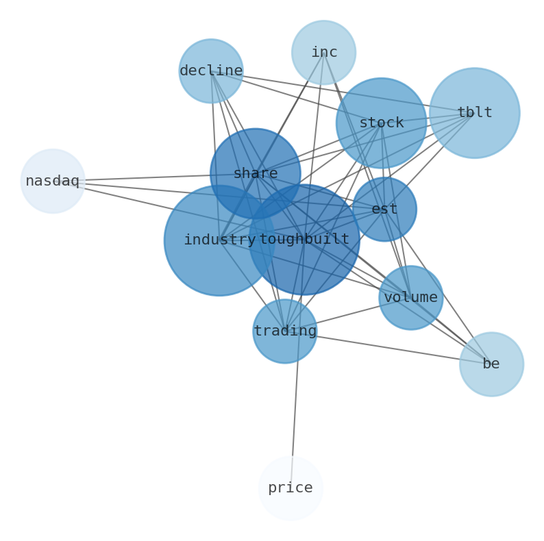 Are looking for the most relevant information about Toughbuilt Industries? Investor spend a lot of time searching for information to make investment decisions in Toughbuilt Industries. This task is often burdensome and consumes huge amounts of free time. It also leads to mistakes due to fatigue and bounded rationality. As a solution, we programmed an artificial intelligence that reads the whole internet and the uses natural language processing and vectorizers to summarize the information. Usually, the AI reads several hundred pages and summarize it to a short document. This document presents our results. We found that the most common words in the internet about Toughbuilt Industries are: Toughbuilt, Industries, share, TBLT, decline, industry, stock, and the most common words in the summary are: inc, llc, product, industry, tool, company, co, . One of the sentences in the summary was: Toughbuilt industries stock is trading at a volume of 691.1K shares as of 13:30 EST. Other searches related to this term that the AI found were: stockmarketlive, livestock, stockmarketforbeginners, thestockmarket, stockmarkettoday, stockmarkettrading, stockmarketstocks, todaystockmarket, thestockmarket, marketnews, stockmarketnews, whatisstockmarket, usstockmarket, stockmarketopen. #inc #llc #product #industry #tool #company #co.