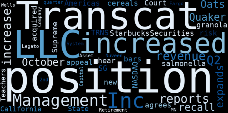 Are looking for the most relevant information about Transcat? Investor spend a lot of time searching for information to make investment decisions in Transcat. This task is often burdensome and consumes huge amounts of free time. It also leads to mistakes due to fatigue and bounded rationality. As a solution, we programmed an artificial intelligence that reads the whole internet and the uses natural language processing and vectorizers to summarize the information. Usually, the AI reads several hundred pages and summarize it to a short document. This document presents our results. We found that the most common words in the internet about Transcat are: increase, position, Transcat, LLC, Inc, Management, report, and the most common words in the summary are: transcat, inc, calibration, service, price, safe, intrinsically, . One of the sentences in the summary was: Quaker Oats expands recall of granola bars and cereals for salmonella risk. Other searches related to this term that the AI found were: stockmarketlive, livestock, stockmarketforbeginners, thestockmarket, stockmarkettoday, stockmarkettrading, stockmarketstocks, todaystockmarket, thestockmarket, marketnews, stockmarketnews, whatisstockmarket, usstockmarket, stockmarketopen. #transcat #inc #calibration #service #price #safe #intrinsically.