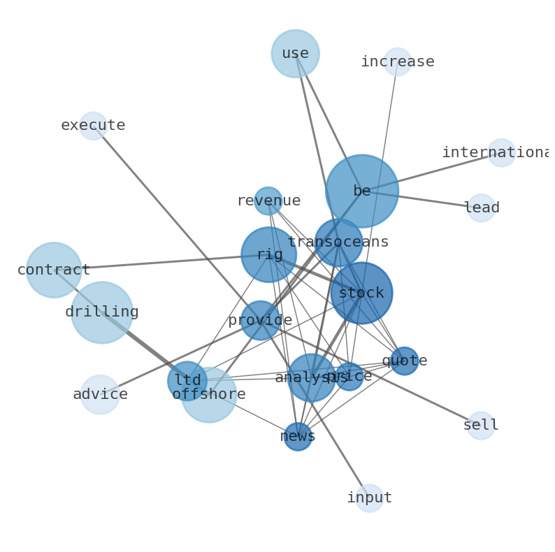 This document will help you to evaluate Transocean without reading an infinite amount of sources. Relying only on stock quotes or prices to make investment decisions is a mistake. Analyzing and observing stock charts, highs and lows and other numerical data does not allow to evaluate the real value of a company. Stock quotes and prices are the result of underlying characteristics of a company and of events and news happening around them. For this reason, investing must be based on information, not numbers. As a solution, we programmed an artificial intelligence that reads the whole internet and the uses natural language processing and vectorizers to summarize the information. Usually, the AI reads several hundred pages and summarize it to a short document. This document presents our results. We found that the most common words in the internet about Transocean are: Transocean, stock, Transoceans, drilling, contract, use, Ltd, and the most common words in the summary are: transocean, stock, market, price, rig, report, watch, . One of the sentences in the summary was: Offshore drilling market grapples with oversupply and weak contracting activity, limiting the uptake of older rigs.. Other searches related to this term that the AI found were: stockmarketlive, livestock, stockmarketforbeginners, thestockmarket, stockmarkettoday, stockmarkettrading, stockmarketstocks, todaystockmarket, thestockmarket, marketnews, stockmarketnews, whatisstockmarket, usstockmarket, stockmarketopen. #transocean #stock #market #price #rig #report #watch.