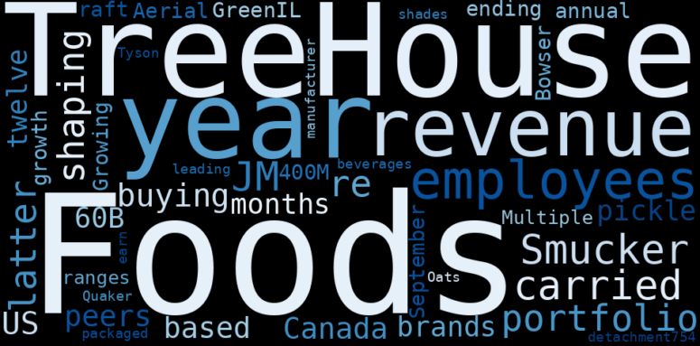 The game is changing. There is a new strategy to evaluate TreeHouse Foods fundamental value, possible risks and most salient advantages. Investors have traditionally relied in reading large amounts of text to evaluate the fundamental value of a stock or company. However, the development of Artificial Intelligence (AI) tools is modifying the way investments are evaluated in markets. Today, machine learning, natural language processing and bigdata allow making this process automatic, reducing large amounts of text to the elements that have a higher activation in a neural network. We programmed an artificial intelligence that reads the whole internet and the uses natural language processing and vectorizers to summarize the information. Usually, the AI reads several hundred pages and summarize it to a short document. This document presents our results. We found that the most common words in the internet about TreeHouse Foods are: TreeHouse, Foods, food, revenue, JM, Smucker, carry, …