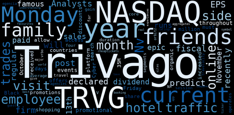 The game is changing. There is a new strategy to evaluate Trivago fundamental value, possible risks and most salient advantages. Investors have traditionally relied in reading large amounts of text to evaluate the fundamental value of a stock or company. However, the development of Artificial Intelligence (AI) tools is modifying the way investments are evaluated in markets. Today, machine learning, natural language processing and bigdata allow making this process automatic, reducing large amounts of text to the elements that have a higher activation in a neural network. We programmed an artificial intelligence that reads the whole internet and the uses natural language processing and vectorizers to summarize the information. Usually, the AI reads several hundred pages and summarize it to a short document. This document presents our results. We found that the most common words in the internet about Trivago are: trivago, Trivago, year, NASDAQ, TRVG, current, Monday, and the …