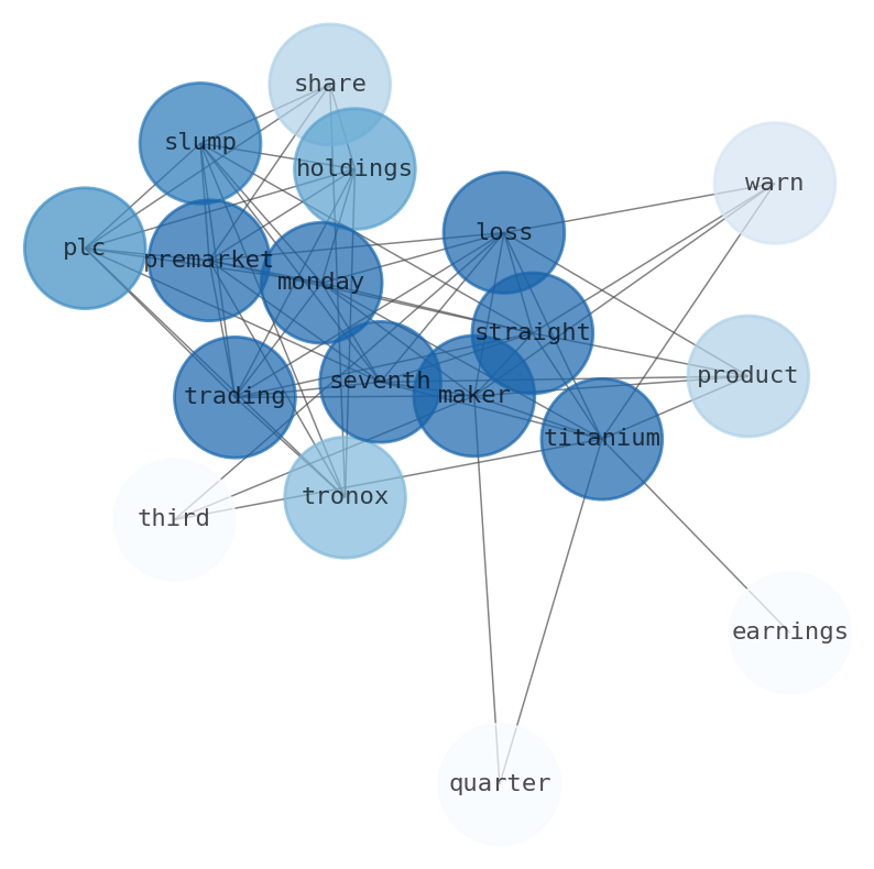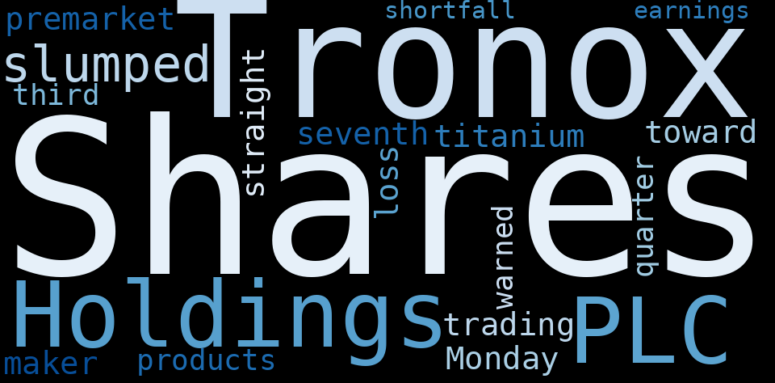 The game is changing. There is a new strategy to evaluate Tronox Holdings fundamental value, possible risks and most salient advantages. Investors have traditionally relied in reading large amounts of text to evaluate the fundamental value of a stock or company. However, the development of Artificial Intelligence (AI) tools is modifying the way investments are evaluated in markets. Today, machine learning, natural language processing and bigdata allow making this process automatic, reducing large amounts of text to the elements that have a higher activation in a neural network. We programmed an artificial intelligence that reads the whole internet and the uses natural language processing and vectorizers to summarize the information. Usually, the AI reads several hundred pages and summarize it to a short document. This document presents our results. We found that the most common words in the internet about Tronox Holdings are: Shares, Tronox, Holdings, PLC, slump, premarket, trading, …