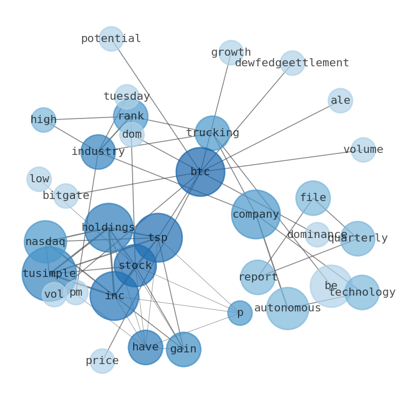 How much time have you spent trying to decide whether investing in TuSimple Holdings? Many investors start with the dream of being free. They expect to find on the stock market an option to have time to develop their own interests and hobbies. That is, a way to escape a 9 to 5 job. However, investment is complex and investors end up spending whole days (and nights) trying to figure out which the right stock to invest is. The dream of stock investing becomes the nightmare of facing infinity amounts of information. As a solution, we programmed an artificial intelligence that reads the whole internet and the uses natural language processing and vectorizers to summarize the information. Usually, the AI reads several hundred pages and summarize it to a short document. This document presents our results. We found that the most common words in the internet about TuSimple Holdings are: Holdings, Inc, TSP, company, TuSimple, BTC, stock, and the most common words in the summary are: tusimple, stock, holding, inc, market, tsp, price, . One of the sentences in the summary was: TuSimple Holdings Inc. Other searches related to this term that the AI found were: stockmarketlive, livestock, stockmarketforbeginners, thestockmarket, stockmarkettoday, stockmarkettrading, stockmarketstocks, todaystockmarket, thestockmarket, marketnews, stockmarketnews, whatisstockmarket, usstockmarket, stockmarketopen. #tusimple #stock #holding #inc #market #tsp #price.