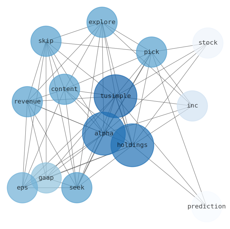The game is changing. There is a new strategy to evaluate TuSimple Holdings fundamental value, possible risks and most salient advantages. Investors have traditionally relied in reading large amounts of text to evaluate the fundamental value of a stock or company. However, the development of Artificial Intelligence (AI) tools is modifying the way investments are evaluated in markets. Today, machine learning, natural language processing and bigdata allow making this process automatic, reducing large amounts of text to the elements that have a higher activation in a neural network. We programmed an artificial intelligence that reads the whole internet and the uses natural language processing and vectorizers to summarize the information. Usually, the AI reads several hundred pages and summarize it to a short document. This document presents our results. We found that the most common words in the internet about TuSimple Holdings are: TuSimple, Holdings, Alpha, GAAP, EPS, revenue, Seeking, …