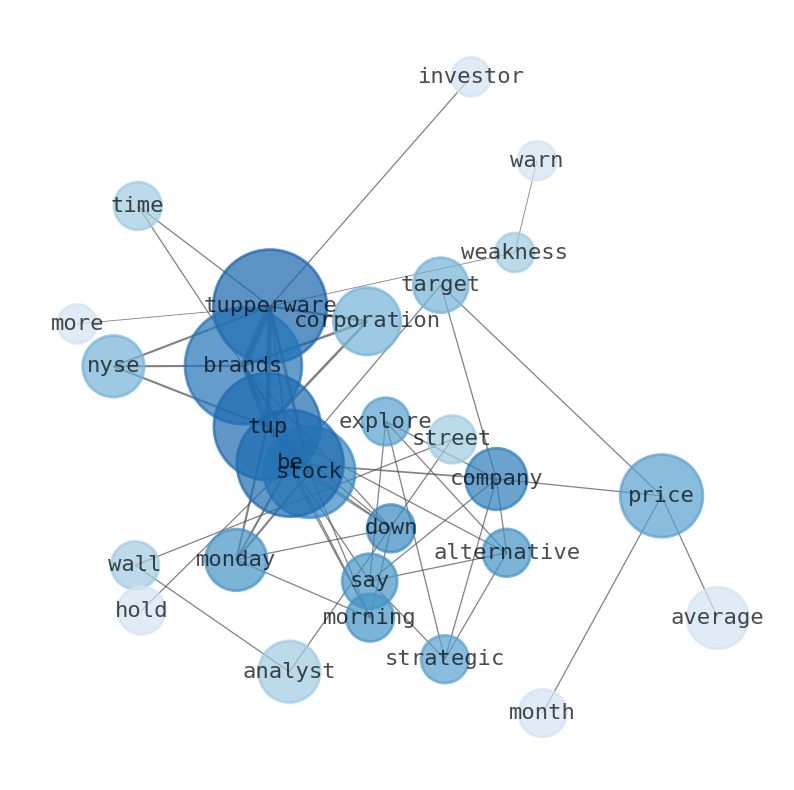 This document will help you to evaluate Tupperware Brands without reading an infinite amount of sources. Relying only on stock quotes or prices to make investment decisions is a mistake. Analyzing and observing stock charts, highs and lows and other numerical data does not allow to evaluate the real value of a company. Stock quotes and prices are the result of underlying characteristics of a company and of events and news happening around them. For this reason, investing must be based on information, not numbers. As a solution, we programmed an artificial intelligence that reads the whole internet and the uses natural language processing and vectorizers to summarize the information. Usually, the AI reads several hundred pages and summarize it to a short document. This document presents our results. We found that the most common words in the internet about Tupperware Brands are: Brands, Tupperware, TUP, stock, price, Corporation, company, …