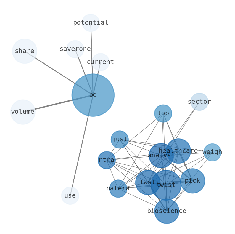 This document will help you to evaluate Twist Bioscience without reading an infinite amount of sources. Relying only on stock quotes or prices to make investment decisions is a mistake. Analyzing and observing stock charts, highs and lows and other numerical data does not allow to evaluate the real value of a company. Stock quotes and prices are the result of underlying characteristics of a company and of events and news happening around them. For this reason, investing must be based on information, not numbers. As a solution, we programmed an artificial intelligence that reads the whole internet and the uses natural language processing and vectorizers to summarize the information. Usually, the AI reads several hundred pages and summarize it to a short document. This document presents our results. We found that the most common words in the internet about Twist Bioscience are: Twist, Analysts, Healthcare, Bioscience, TWST, ET, volume, and the most common words in the summary are: bioscience, twist, stock, job, twst, market, corp, . One of the sentences in the summary was: The biggest reason why Twist is currently valued at $1.9 billion is the potential to use their silicon DNA synthesis platform for the discovery of new drugs.. Other searches related to this term that the AI found were: stockmarketlive, livestock, stockmarketforbeginners, thestockmarket, stockmarkettoday, stockmarkettrading, stockmarketstocks, todaystockmarket, thestockmarket, marketnews, stockmarketnews, whatisstockmarket, usstockmarket, stockmarketopen. #bioscience #twist #stock #job #twst #market #corp.