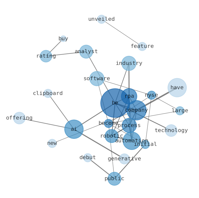 Are looking for the most relevant information about UiPath? Investor spend a lot of time searching for information to make investment decisions in UiPath. This task is often burdensome and consumes huge amounts of free time. It also leads to mistakes due to fatigue and bounded rationality. As a solution, we programmed an artificial intelligence that reads the whole internet and the uses natural language processing and vectorizers to summarize the information. Usually, the AI reads several hundred pages and summarize it to a short document. This document presents our results. We found that the most common words in the internet about UiPath are: UiPath, company, AI, RPA, software, industry, automation, and the most common words in the summary are: uipath, stock, automation, market, ai, company, year, . One of the sentences in the summary was: Robotic Process Automation (RPA) is a technology that enables businesses to automate the mundane …