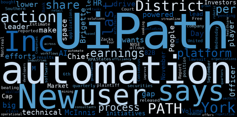 The game is changing. There is a new strategy to evaluate UiPath fundamental value, possible risks and most salient advantages. Investors have traditionally relied in reading large amounts of text to evaluate the fundamental value of a stock or company. However, the development of Artificial Intelligence (AI) tools is modifying the way investments are evaluated in markets. Today, machine learning, natural language processing and bigdata allow making this process automatic, reducing large amounts of text to the elements that have a higher activation in a neural network. We programmed an artificial intelligence that reads the whole internet and the uses natural language processing and vectorizers to summarize the information. Usually, the AI reads several hundred pages and summarize it to a short document. This document presents our results. We found that the most common words in the internet about UiPath are: UiPath, automation, user, say, Inc, action, District, and the …