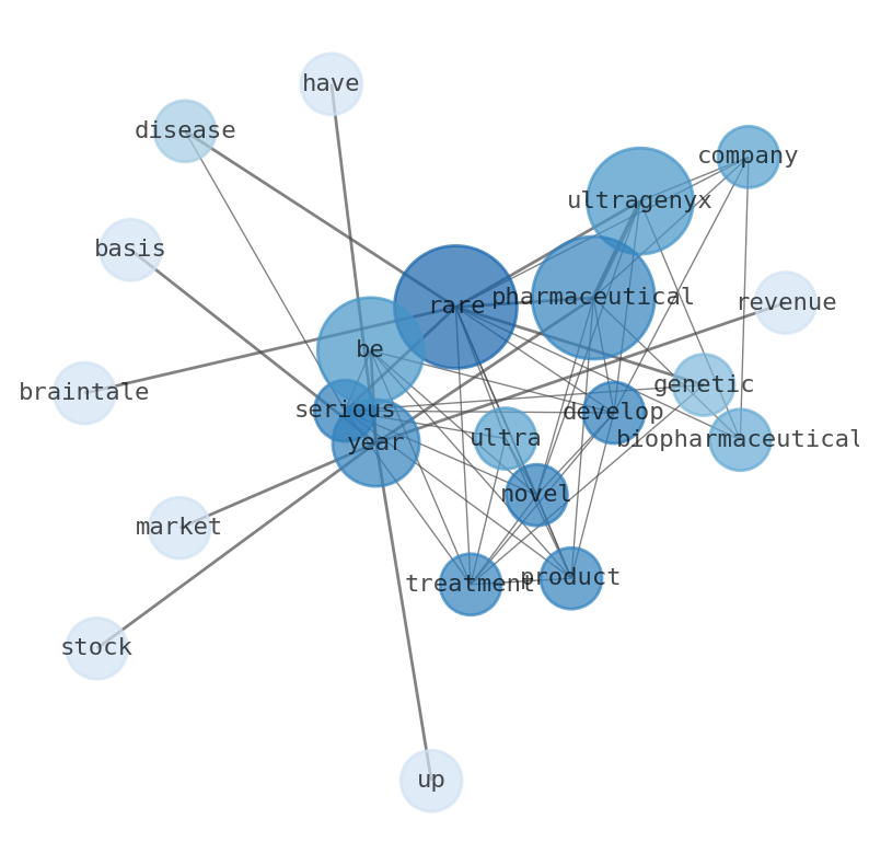 The game is changing. There is a new strategy to evaluate Ultragenyx Pharmaceutical fundamental value, possible risks and most salient advantages. Investors have traditionally relied in reading large amounts of text to evaluate the fundamental value of a stock or company. However, the development of Artificial Intelligence (AI) tools is modifying the way investments are evaluated in markets. Today, machine learning, natural language processing and bigdata allow making this process automatic, reducing large amounts of text to the elements that have a higher activation in a neural network. We programmed an artificial intelligence that reads the whole internet and the uses natural language processing and vectorizers to summarize the information. Usually, the AI reads several hundred pages and summarize it to a short document. This document presents our results. We found that the most common words in the internet about Ultragenyx Pharmaceutical are: Ultragenyx, Pharmaceutical, analysis, Biopharmaceutical, company, RARE, develop, …