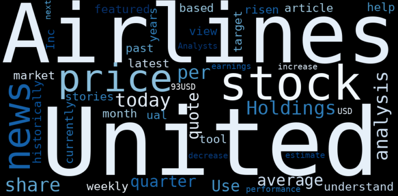 How much time have you spent trying to decide whether investing in United Airlines Holdings? Many investors start with the dream of being free. They expect to find on the stock market an option to have time to develop their own interests and hobbies. That is, a way to escape a 9 to 5 job. However, investment is complex and investors end up spending whole days (and nights) trying to figure out which the right stock to invest is. The dream of stock investing becomes the nightmare of facing infinity amounts of information. As a solution, we programmed an artificial intelligence that reads the whole internet and the uses natural language processing and vectorizers to summarize the information. Usually, the AI reads several hundred pages and summarize it to a short document. This document presents our results. We found that the most common words in the internet about United Airlines …