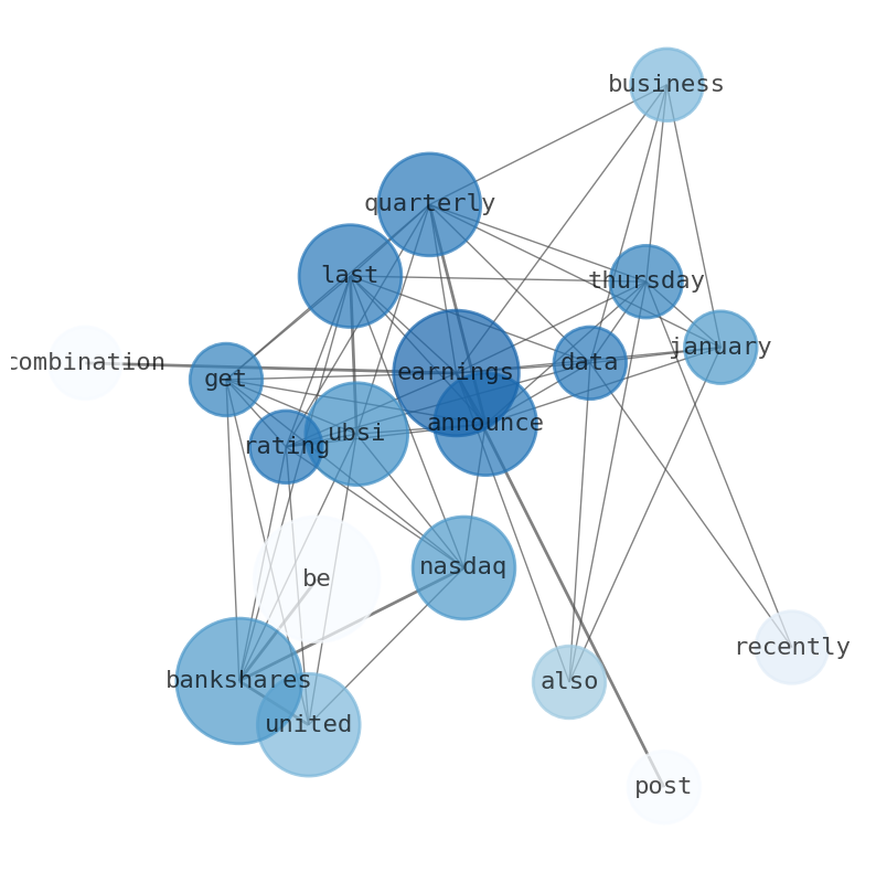 This document will help you to evaluate United Bankshares without reading an infinite amount of sources. Relying only on stock quotes or prices to make investment decisions is a mistake. Analyzing and observing stock charts, highs and lows and other numerical data does not allow to evaluate the real value of a company. Stock quotes and prices are the result of underlying characteristics of a company and of events and news happening around them. For this reason, investing must be based on information, not numbers. As a solution, we programmed an artificial intelligence that reads the whole internet and the uses natural language processing and vectorizers to summarize the information. Usually, the AI reads several hundred pages and summarize it to a short document. This document presents our results. We found that the most common words in the internet about United Bankshares are: earnings, United, Bankshares, last, announce, quarterly, NASDAQUBSI, …