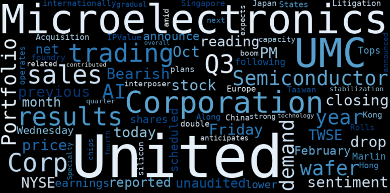 The game is changing. There is a new strategy to evaluate United Microelectronics fundamental value, possible risks and most salient advantages. Investors have traditionally relied in reading large amounts of text to evaluate the fundamental value of a stock or company. However, the development of Artificial Intelligence (AI) tools is modifying the way investments are evaluated in markets. Today, machine learning, natural language processing and bigdata allow making this process automatic, reducing large amounts of text to the elements that have a higher activation in a neural network. We programmed an artificial intelligence that reads the whole internet and the uses natural language processing and vectorizers to summarize the information. Usually, the AI reads several hundred pages and summarize it to a short document. This document presents our results. We found that the most common words in the internet about United Microelectronics are: United, UMC, Microelectronics, Corporation, Corp, sale, announce, …