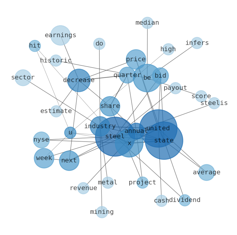 This document will help you to evaluate United States Steel without reading an infinite amount of sources. Relying only on stock quotes or prices to make investment decisions is a mistake. Analyzing and observing stock charts, highs and lows and other numerical data does not allow to evaluate the real value of a company. Stock quotes and prices are the result of underlying characteristics of a company and of events and news happening around them. For this reason, investing must be based on information, not numbers. As a solution, we programmed an artificial intelligence that reads the whole internet and the uses natural language processing and vectorizers to summarize the information. Usually, the AI reads several hundred pages and summarize it to a short document. This document presents our results. We found that the most common words in the internet about United States Steel are: United, States, Steel, X, share, price, decrease, and the most common words in the summary are: steel, state, united, republic, stock, x, best, . One of the sentences in the summary was: The average price target represents a decrease of 13.16%.. Other searches related to this term that the AI found were: stockmarketlive, livestock, stockmarketforbeginners, thestockmarket, stockmarkettoday, stockmarkettrading, stockmarketstocks, todaystockmarket, thestockmarket, marketnews, stockmarketnews, whatisstockmarket, usstockmarket, stockmarketopen. #steel #state #united #republic #stock #x #best.