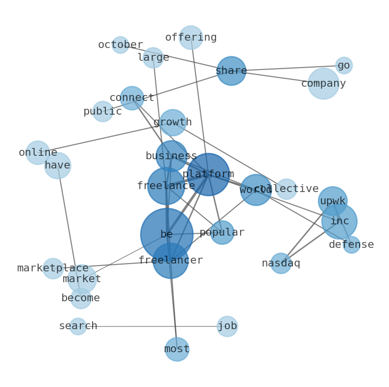 Are looking for the most relevant information about Upwork? Investor spend a lot of time searching for information to make investment decisions in Upwork. This task is often burdensome and consumes huge amounts of free time. It also leads to mistakes due to fatigue and bounded rationality. As a solution, we programmed an artificial intelligence that reads the whole internet and the uses natural language processing and vectorizers to summarize the information. Usually, the AI reads several hundred pages and summarize it to a short document. This document presents our results. We found that the most common words in the internet about Upwork are: Upwork, platform, freelancer, Inc, freelance, business, world, and the most common words in the summary are: upwork, freelancer, platform, business, market, stock, work, . One of the sentences in the summary was: (upwk) Latest Stock News & Headlines - Yahoo Finance.com. Other searches related to this …