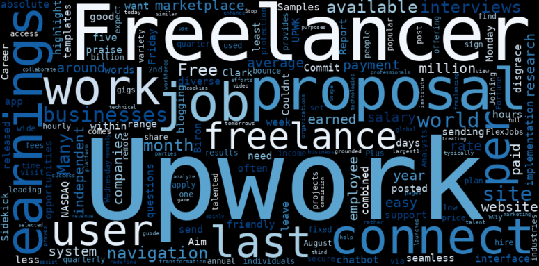 How much time have you spent trying to decide whether investing in Upwork? Many investors start with the dream of being free. They expect to find on the stock market an option to have time to develop their own interests and hobbies. That is, a way to escape a 9 to 5 job. However, investment is complex and investors end up spending whole days (and nights) trying to figure out which the right stock to invest is. The dream of stock investing becomes the nightmare of facing infinity amounts of information. As a solution, we programmed an artificial intelligence that reads the whole internet and the uses natural language processing and vectorizers to summarize the information. Usually, the AI reads several hundred pages and summarize it to a short document. This document presents our results. We found that the most common words in the internet about Upwork are: Upwork, Freelancers, …