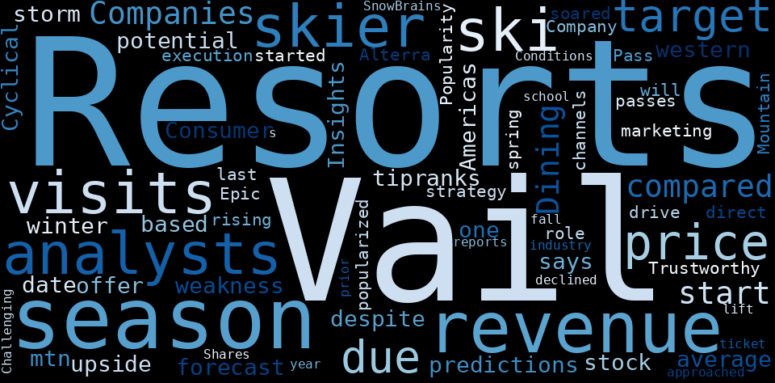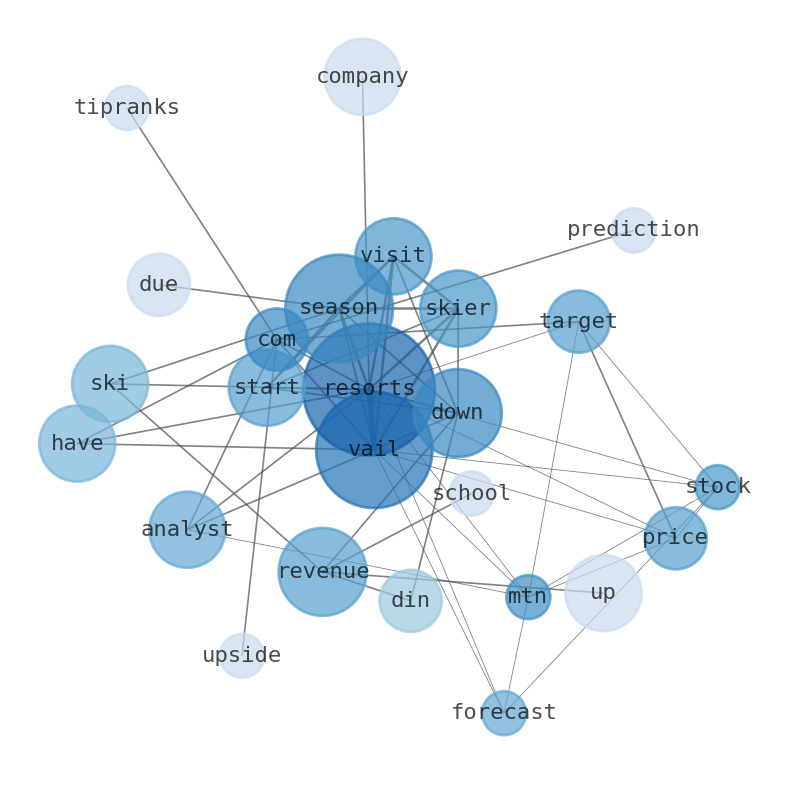 This document will help you to evaluate Vail Resorts without reading an infinite amount of sources. Relying only on stock quotes or prices to make investment decisions is a mistake. Analyzing and observing stock charts, highs and lows and other numerical data does not allow to evaluate the real value of a company. Stock quotes and prices are the result of underlying characteristics of a company and of events and news happening around them. For this reason, investing must be based on information, not numbers. As a solution, we programmed an artificial intelligence that reads the whole internet and the uses natural language processing and vectorizers to summarize the information. Usually, the AI reads several hundred pages and summarize it to a short document. This document presents our results. We found that the most common words in the internet about Vail Resorts are: Vail, Resorts, season, revenue, resort, skier, visit, …