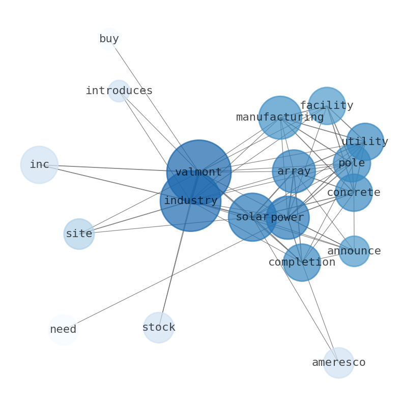 This document will help you to evaluate Valmont Industries without reading an infinite amount of sources. Relying only on stock quotes or prices to make investment decisions is a mistake. Analyzing and observing stock charts, highs and lows and other numerical data does not allow to evaluate the real value of a company. Stock quotes and prices are the result of underlying characteristics of a company and of events and news happening around them. For this reason, investing must be based on information, not numbers. As a solution, we programmed an artificial intelligence that reads the whole internet and the uses natural language processing and vectorizers to summarize the information. Usually, the AI reads several hundred pages and summarize it to a short document. This document presents our results. We found that the most common words in the internet about Valmont Industries are: Valmont, Industries, solar, array, power, announce, facility, and the most common words in the summary are: valmont, industry, stock, inc, business, vmi, market, . One of the sentences in the summary was: Valmont Industries unveiled its on-site 718 kilowatt solar array, which is expected to power all of the Bristol plants needs. Other searches related to this term that the AI found were: stockmarketlive, livestock, stockmarketforbeginners, thestockmarket, stockmarkettoday, stockmarkettrading, stockmarketstocks, todaystockmarket, thestockmarket, marketnews, stockmarketnews, whatisstockmarket, usstockmarket, stockmarketopen. #valmont #industry #stock #inc #business #vmi #market.