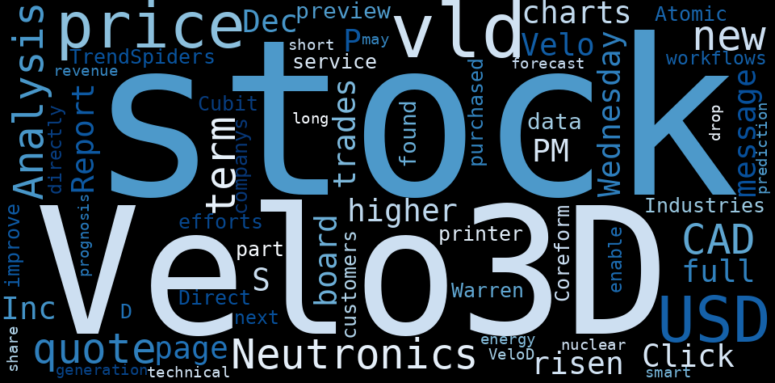 The game is changing. There is a new strategy to evaluate Velo3D fundamental value, possible risks and most salient advantages. Investors have traditionally relied in reading large amounts of text to evaluate the fundamental value of a stock or company. However, the development of Artificial Intelligence (AI) tools is modifying the way investments are evaluated in markets. Today, machine learning, natural language processing and bigdata allow making this process automatic, reducing large amounts of text to the elements that have a higher activation in a neural network. We programmed an artificial intelligence that reads the whole internet and the uses natural language processing and vectorizers to summarize the information. Usually, the AI reads several hundred pages and summarize it to a short document. This document presents our results. We found that the most common words in the internet about Velo3D are: stock, Velo3D, price, quote, vld, CAD, USD, and the …