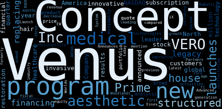 The game is changing. There is a new strategy to evaluate Venus Concept fundamental value, possible risks and most salient advantages. Investors have traditionally relied in reading large amounts of text to evaluate the fundamental value of a stock or company. However, the development of Artificial Intelligence (AI) tools is modifying the way investments are evaluated in markets. Today, machine learning, natural language processing and bigdata allow making this process automatic, reducing large amounts of text to the elements that have a higher activation in a neural network. We programmed an artificial intelligence that reads the whole internet and the uses natural language processing and vectorizers to summarize the information. Usually, the AI reads several hundred pages and summarize it to a short document. This document presents our results. We found that the most common words in the internet about Venus Concept are: Venus, Concept, program, medical, aesthetic, technology, Inc, …