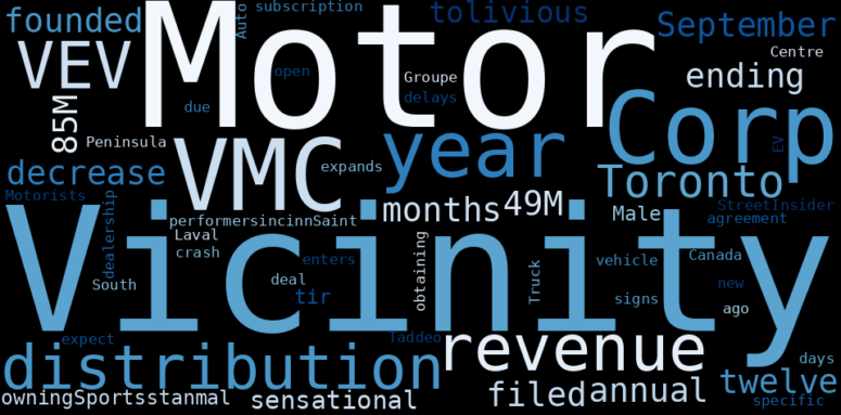 This document will help you to evaluate Vicinity Motor without reading an infinite amount of sources. Relying only on stock quotes or prices to make investment decisions is a mistake. Analyzing and observing stock charts, highs and lows and other numerical data does not allow to evaluate the real value of a company. Stock quotes and prices are the result of underlying characteristics of a company and of events and news happening around them. For this reason, investing must be based on information, not numbers. As a solution, we programmed an artificial intelligence that reads the whole internet and the uses natural language processing and vectorizers to summarize the information. Usually, the AI reads several hundred pages and summarize it to a short document. This document presents our results. We found that the most common words in the internet about Vicinity Motor are: Vicinity, Motor, Corp, VMC, revenue, distribution, Toronto, …