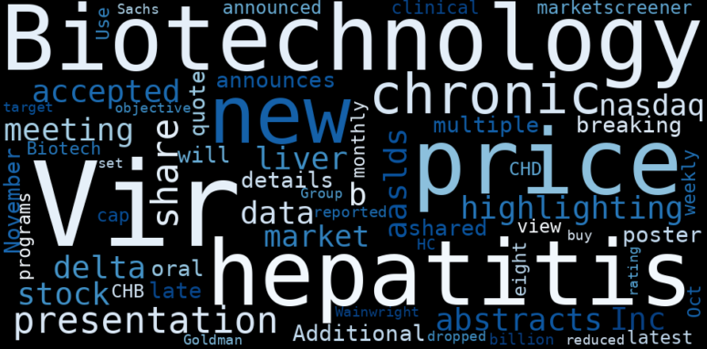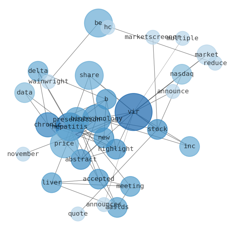 Are looking for the most relevant information about Vir Biotechnology? Investor spend a lot of time searching for information to make investment decisions in Vir Biotechnology. This task is often burdensome and consumes huge amounts of free time. It also leads to mistakes due to fatigue and bounded rationality. As a solution, we programmed an artificial intelligence that reads the whole internet and the uses natural language processing and vectorizers to summarize the information. Usually, the AI reads several hundred pages and summarize it to a short document. This document presents our results. We found that the most common words in the internet about Vir Biotechnology are: Vir, Biotechnology, hepatitis, share, price, chronic, presentation, and the most common words in the summary are: inc, vir, biotechnology, health, univ, news, research, . One of the sentences in the summary was: Additional details on the late breaking poster and oral presentations will …