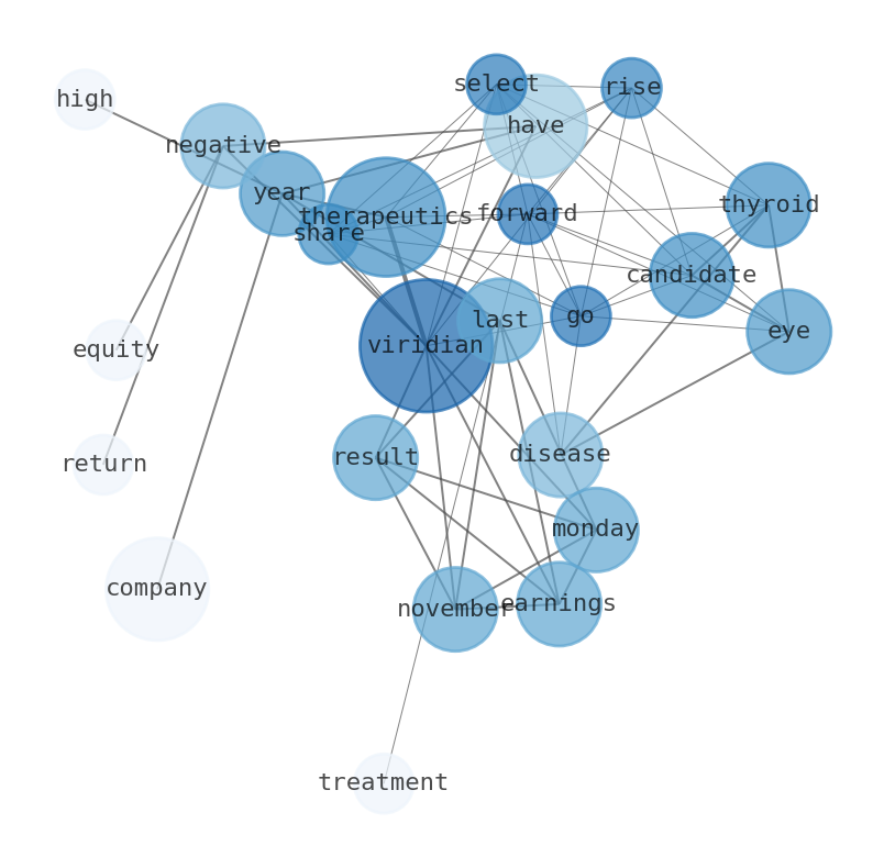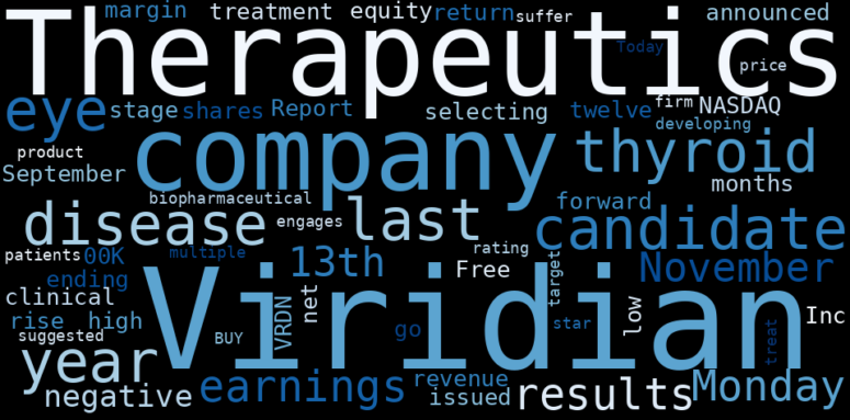The game is changing. There is a new strategy to evaluate Viridian Therapeutics fundamental value, possible risks and most salient advantages. Investors have traditionally relied in reading large amounts of text to evaluate the fundamental value of a stock or company. However, the development of Artificial Intelligence (AI) tools is modifying the way investments are evaluated in markets. Today, machine learning, natural language processing and bigdata allow making this process automatic, reducing large amounts of text to the elements that have a higher activation in a neural network. We programmed an artificial intelligence that reads the whole internet and the uses natural language processing and vectorizers to summarize the information. Usually, the AI reads several hundred pages and summarize it to a short document. This document presents our results. We found that the most common words in the internet about Viridian Therapeutics are: Viridian, Therapeutics, candidate, thyroid, eye, disease, company, …